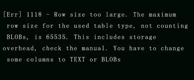 错误1这个报错其实我们查询MySQL官方手册就可以查询到, 对于一行记录最大的限制是65535字节。为什么是65535,不要问我,手册也没说:)——一行数据里面字段长度定义有64k,我也是醉了。错误2既生瑜何生亮?有了65535的限制以后还有一个8126的限制是为什么呢?