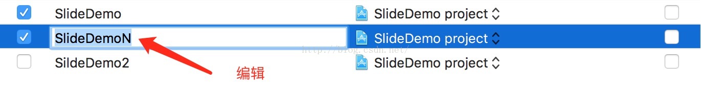 2.修改新建的target的名称。点击Manage Schemes进入管理页面,双击需要编辑的Scheme,进行名称的修改。