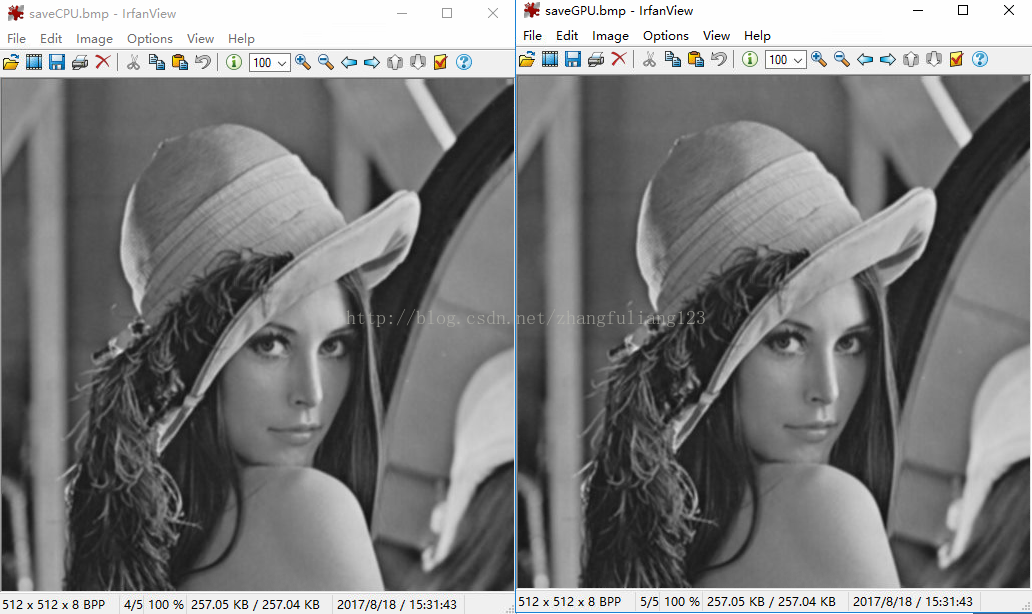 #include <stdio.h> #include <stdlib.h> #include <string.h> #include <time.h> #include "readImage.h" extern "C" void gpuSmoothImage(int width, int height, unsigned char* srcData, unsigned char* dstData); extern "C" void cpuSmoothImage(unsigned char* srcData, unsigned char* dstData, int width, int height); extern "C" void gpuSmoothImageTexture(int width, int height, unsigned char* srcData, unsigned char* dstData); int main() { const char* path = "lena.bmp"; int Width, Height; unsigned char* readData = readImageData(path, Width, Height); printf("w:%d h:%d ", Width, Height); //showBmpHead(); //showBmpInforHead(); //CPU smooth Image clock_t t1, t2; unsigned char* moothData = NULL; moothData = (unsigned char*)malloc(Width*Height * sizeof(unsigned char)); cpuSmoothImage(readData, moothData, Width, Height); const char * savePath = "saveCPU.bmp"; saveImageData(savePath, Width, Height, moothData); /* for (int i = 0; i < 100; i++) { for (int j = 0; j < 10; j++) { printf("%5d", moothData[i*Width + j]); } printf(" "); }*/ //GPU smooth Image unsigned char* result = NULL; result = (unsigned char*)malloc(Width*Height * sizeof(unsigned char)); const char * savePath1 = "saveGPU.bmp"; gpuSmoothImage(Width, Height, readData, result); //gpuSmoothImageTexture(Width, Height, readData, result); saveImageData(savePath1, Width, Height, result); /*printf("GPUdata: "); for (int i = 0; i < 100; i++) { for (int j = 0; j < 10; j++) { printf("%5d", result[i*Width + j]); } printf(" "); } */ return 0; }实验结果: