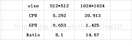 可以看到GPU和CPU的平滑结果完全一样,我们再看下并行加速的效果,图片在1024的时候加速了14.67倍,效果还是很好的。