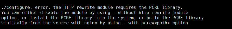 又提示如上的错误,说要使用rewrite就必须要安装PCRE这个lib库,执行以下命令进行安装: