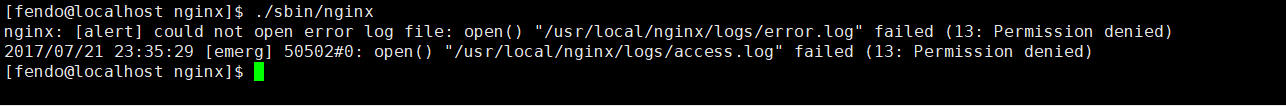 nginx: [alert] could not open error log file: open() "/usr/local/nginx/logs/error.log" failed (13: Permission denied) 2017/07/21 23:35:29 [emerg] 50502#0: open() "/usr/local/nginx/logs/access.log" failed (13: Permission denied)