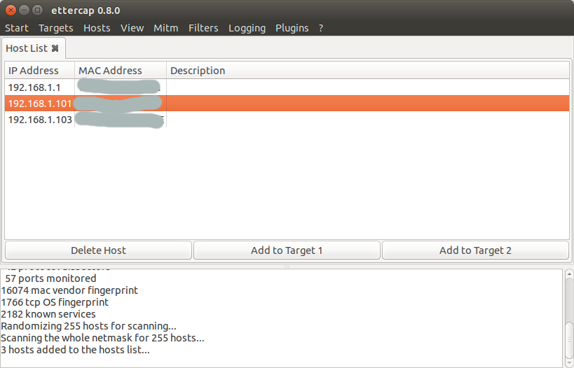 3,Hosts--Host list Hosts---scan for hosts,可以发现192.168.1.1是路由器的IP地址,101和103是另外两台连入这个无线的主机(我的手机和Ipad)