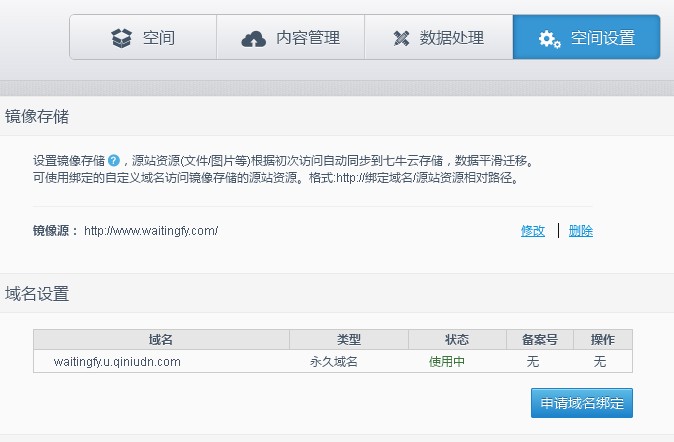 4.1.去“七牛”官方网站申请帐号,新建空间,把空间设置为公开,先不要着急上传内容,点击空间设置,把镜像源设置为你博客地址,记下下面域名地址。