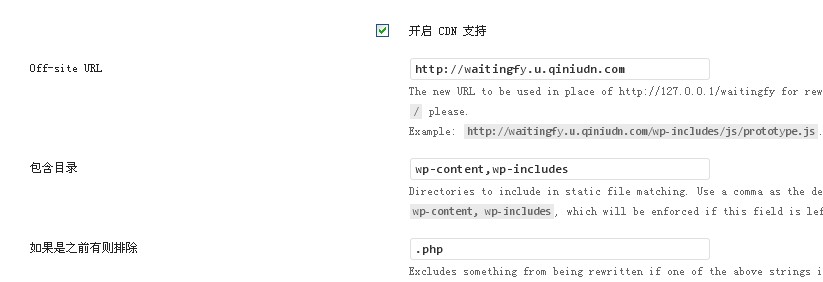 4.2.安装wp super cache, 点击CDN标签,勾选“开启 CDN 支持,输入上面申请的域名。