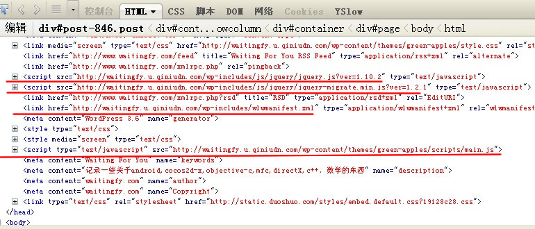 接下来访问你博客的任意页面,所有wp-content,wp-includes 下面的静态资源自动上传到七牛的服务器上,页面中也自动变了,使用太方便了,就是更新内容会有点麻烦。