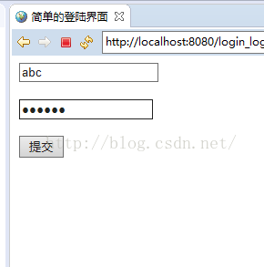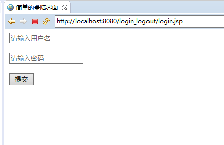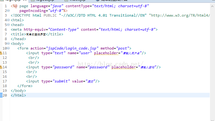 <%@ page language="java" contentType="text/html; charset=utf-8" pageEncoding="utf-8"%> <!DOCTYPE html PUBLIC "-//W3C//DTD HTML 4.01 Transitional//EN" "http://www.w3.org/TR/html4/loose.dtd"> <html> <head> <meta http-equiv="Content-Type" content="text/html; charset=utf-8"> <title>简单的登陆界面</title> </head> <body> <form action="jspCode/login_code.jsp" method="post"> <input type="text" name="user" placeholder="请输入用户名"/> <br/> <br/> <input type="password" name="password" placeholder="请输入密码"/> <br/> <br/> <input type="submit" value="提交"/> </form> </body> </html>