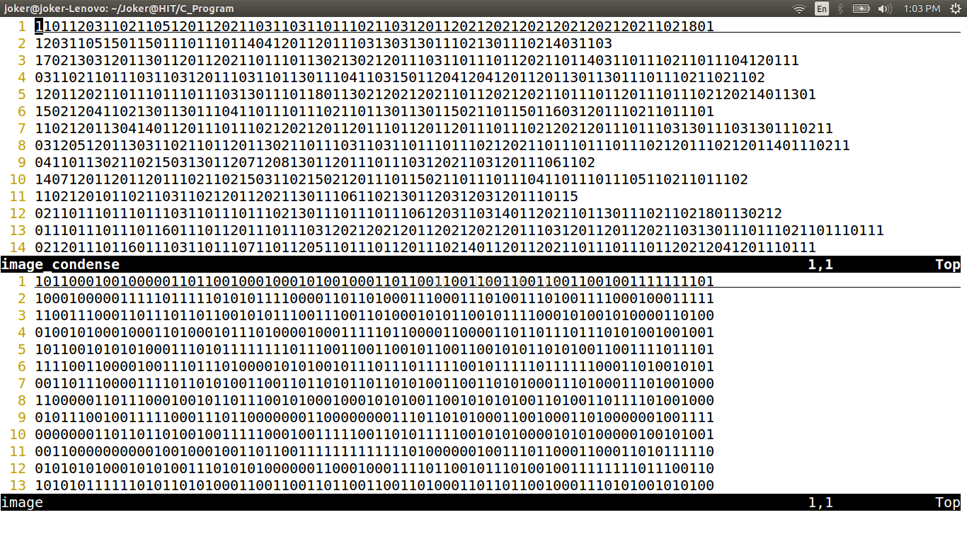 上述程序的功能是用户通过命令行参数输入两个文件名,执行程序时,先建立模拟数字图像的文件,全为01序列,图像大小由用户输入,然后将该文件通过上述思路压缩,另存为压缩文件,最后程序在屏幕上列出新建两个文件的信息。