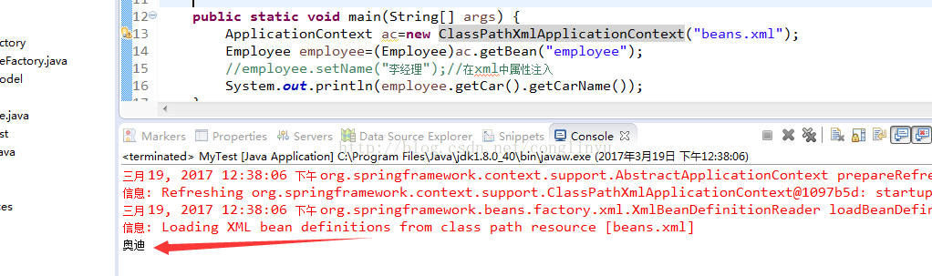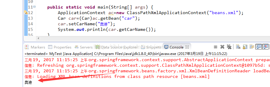public class MyTest { public static void main(String[] args) { ApplicationContext ac=new ClassPathXmlApplicationContext("beans.xml"); Car car=(Car)ac.getBean("car"); car.setCarName("奥迪"); System.out.println(car.getCarName()); } }