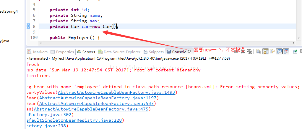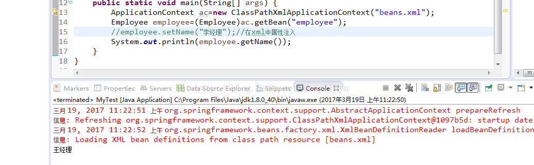 <?xml version="1.0" encoding="UTF-8"?> <beans xmlns="http://www.springframework.org/schema/beans" xmlns:xsi="http://www.w3.org/2001/XMLSchema-instance" xsi:schemaLocation="http://www.springframework.org/schema/beans http://www.springframework.org/schema/beans/spring-beans.xsd"> <bean id="car" class="com.zhiqi.model.Car"></bean> <bean id="employee" class="com.zhiqi.model.Employee"> <property name="id" value="10010"></property> <property name="name" value="王经理"></property> <property name="sex" value="男"></property> </bean> </beans>