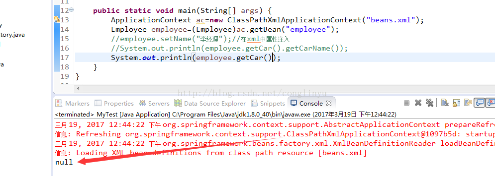 <?xml version="1.0" encoding="UTF-8"?> <beans xmlns="http://www.springframework.org/schema/beans" xmlns:xsi="http://www.w3.org/2001/XMLSchema-instance" xsi:schemaLocation="http://www.springframework.org/schema/beans http://www.springframework.org/schema/beans/spring-beans.xsd"> <bean id="car" class="com.zhiqi.model.Car"> <property name="id" value="2007"></property> <property name="carName" value="奥迪"></property> </bean> <bean id="employee" class="com.zhiqi.model.Employee"> <property name="id" value="10080"></property> <property name="name" value="贾经理"></property> <property name="sex" value="男"></property> <property name="car"> <null></null> </property> </bean> </beans>