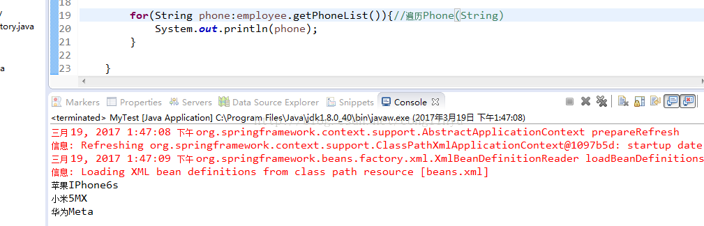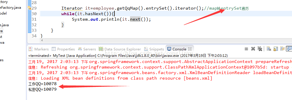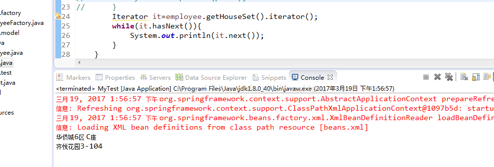 <?xml version="1.0" encoding="UTF-8"?> <beans xmlns="http://www.springframework.org/schema/beans" xmlns:xsi="http://www.w3.org/2001/XMLSchema-instance" xsi:schemaLocation="http://www.springframework.org/schema/beans http://www.springframework.org/schema/beans/spring-beans.xsd"> <!--bean id="car" class="com.zhiqi.model.Car"> <property name="id" value="2007"></property> <property name="carName" value="奥迪"></property> </bean--> <bean id="employee" class="com.zhiqi.model.Employee"> <property name="id" value="10080"></property> <property name="name" value="贾经理"></property> <property name="sex" value="男"></property> <!-- 内部bean 需要new --> <!--property name="car.id" value="8008"></property> <property name="car.carName" value="保时捷"></property--> <property name="phoneList"> <list> <value>苹果IPhone6s</value> <value>小米5MX</value> <value>华为Meta</value> </list> </property> <property name="houseSet"> <set> <value>华侨城6区 C座</value> <value>齐悦花园3-104</value> </set> </property> <property name="qqMap"> <map> <entry> <key><value>工作QQ</value></key> <value>10078</value> </entry> <entry> <key><value>私密QQ</value></key> <value>10079</value> </entry> </map> </property> </bean> </beans>运行: