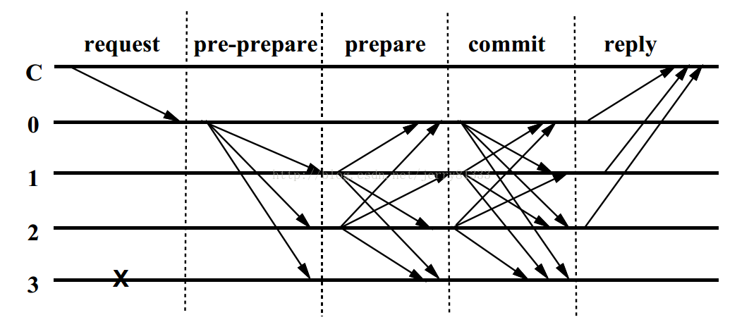 基于拜占庭将军问题,一致性的确保主要分为这三个阶段:预准备(pre-prepare)、准备(prepare)和确认(commit)。流程如下图所示: