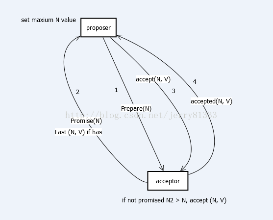 PAXOS中有三类角色Proposer、Acceptor及Learner,主要交互过程在Proposer和Acceptor之间,做成图便如下图所示: