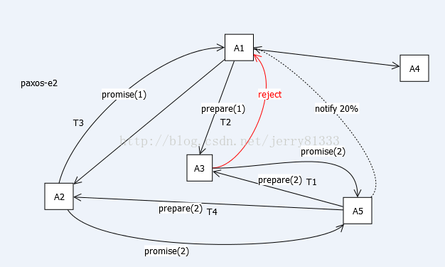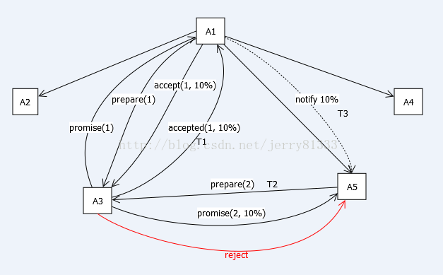 A3在T1发出accepted给A1,然后在T2收到A5的prepare,在T3的时候A1才通知A5最终结果(税率10%)。这里会有两种情况: