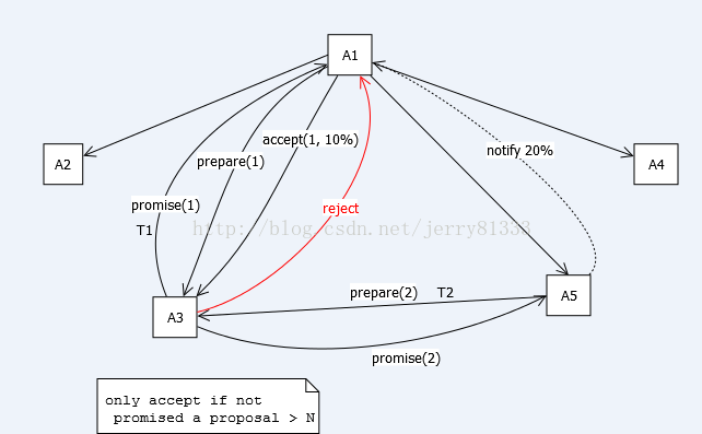 1. A5发来的N5小于A1发出去的N1,那么A3直接拒绝(reject)A5