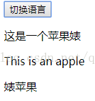 <!DOCTYPE html> <html> <head> <meta charset="utf-8" /> <title>Language change</title> <script type="text/javascript"> function changeLanguage(){ document.getElementById("p1").innerHTML="这是一个苹果婊"; document.getElementById("p3").innerHTML="婊苹果"; } </script> </head> <body> <input type="button" onclick="changeLanguage()" value="切换语言" /> <div id="div1"> <p id="p1">This is a pen</p> <p id="p2">This is an apple</p> <p id="p3">applepen pen</p> </div> </body> </html>初始界面: