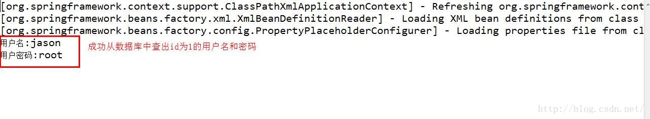 在service包下serviceImpl包下新建UserServiceImpl类<span style="font-size:18px;"><span style="font-size:18px;">package com.cntv.service.serviceImpl; import javax.annotation.Resource; import javax.servlet.http.HttpServletResponse; import org.springframework.context.ApplicationContext; import org.springframework.context.support.ClassPathXmlApplicationContext; import org.springframework.stereotype.Service; import com.cntv.dao.IUserDao; import com.cntv.entity.User; import com.cntv.service.IUserService; import org.springframework.http.converter.json.MappingJackson2HttpMessageConverter; @Service public class UserServiceImpl implements IUserService { @Resource private IUserDao userDao; @Override public User getUserById(int userId) { // TODO Auto-generated method stub return this.userDao.selectByPrimaryKey(userId); } public static void main(String[] args) { ApplicationContext ca= new ClassPathXmlApplicationContext("spring-mybatis.xml"); UserServiceImpl u=(UserServiceImpl) ca.getBean("userServiceImpl"); User ue= u.getUserById(12); System.out.println("用户名:"+ue.getUserName()); <span> </span> System.out.println("用户密码:"+ue.getPassword()); } public IUserDao getUserDao() { return userDao; } public void setUserDao(IUserDao userDao) { this.userDao = userDao; } }</span><span style="font-size:14px;"> </span></span>