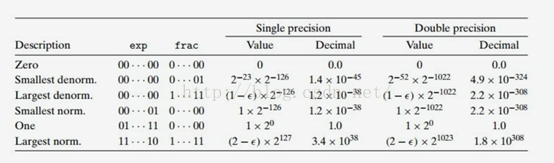 以下这个图给出了单双精度中上述六种值的表示方式以及它们的值,我们也可以根据上面的公式自己算出来.本屌是个数学白痴,就不给你们算了.