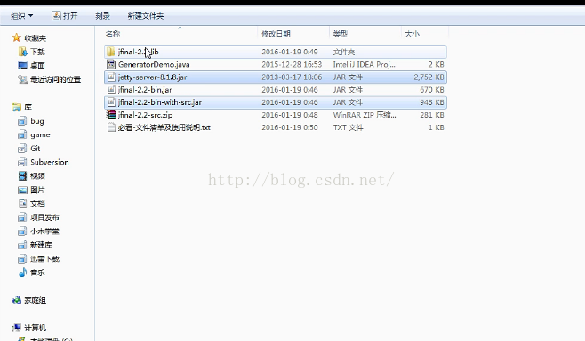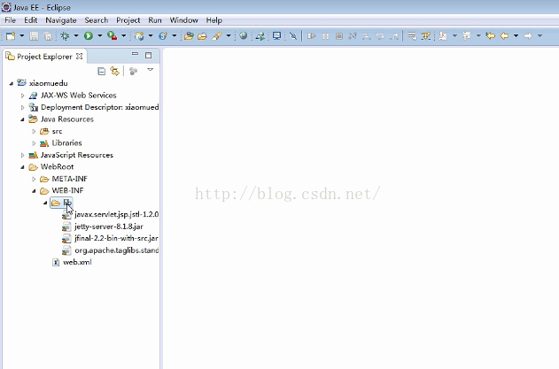 把jetty-server-8.1.8.jar和jfinal-2.2-bin-with-src.jar(方便看Jfinal的源代码)放到项目WEB-INFlib下,