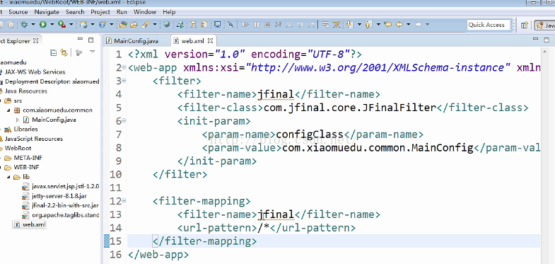 配置一下JFinal的统一入口JFinalFilter过滤器,它的过滤配置为MainConfig