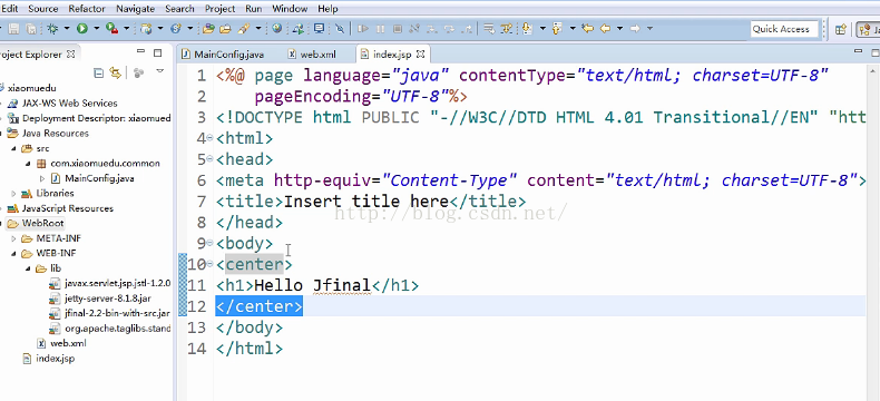 我们需要引入4个jar包 分别为javax.servlet.jsp.jstl.1.2.0.jar、jetty-server-8.1.8.jar、jfinal-2.2-bin-with-src.jar