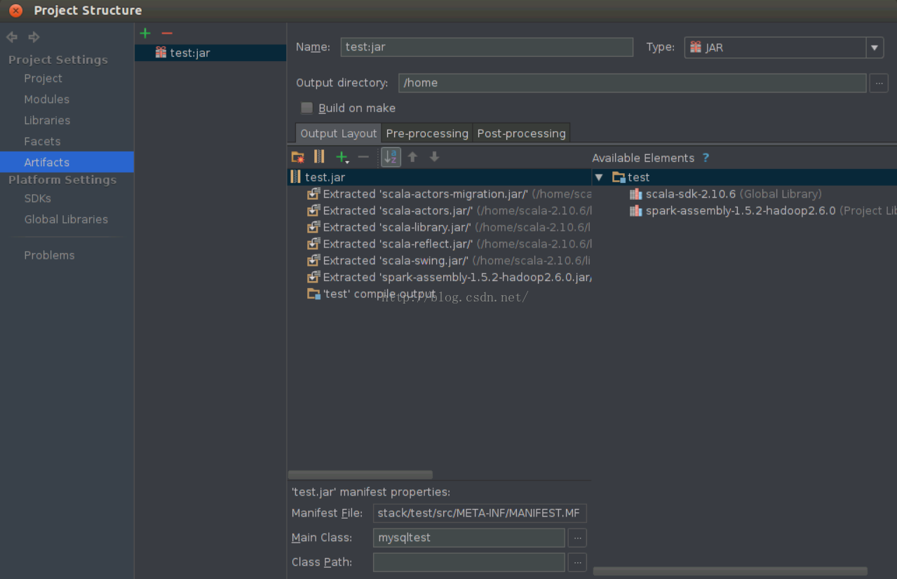 为了测试程序在Spark集群环境下的分布式计算的效果,需要把程序打成jar包,才能运行在spark 集群中,可以按照以下步骤操作:依次选择“File”–> “Project Structure” –> “Artifact”,选择“+”–> “Jar” –> “From Modules with dependencies”,选择main函数,并在弹出框中选择输出jar位置,并选择“OK”。