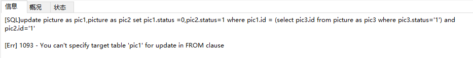 update picture as pic1,picture as pic2 set pic1.status =0,pic2.status=1 where pic1.id="3" and pic2.id="1"