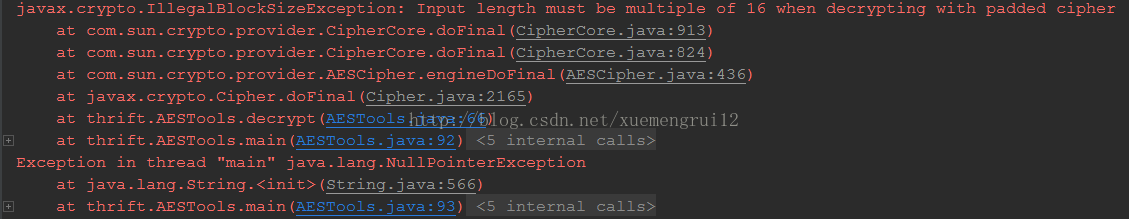 //解密 try { String encryptResultStr = new String(encryptResult, "utf-8"); byte[] decryptResult = decrypt(encryptResultStr.getBytes("utf-8"), password); System.out.println("解密后:" + new String(decryptResult)); } catch (UnsupportedEncodingException e) { e.printStackTrace(); }运行后,会报如下错误: