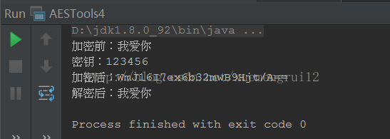 public static void main(String[] args) throws Exception { String test = "我爱你"; System.out.println("加密前:" + test); String key = "123456"; System.out.println("密钥:" + key); String encrypt = aesEncrypt(test, key); System.out.println("加密后:" + encrypt); String decrypt = aesDecrypt(encrypt, key); System.out.println("解密后:" + decrypt); }