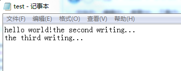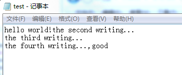 f = open("E:/test.txt","a") f.writelines([" the fourth writing...",",","good"]) f.close()