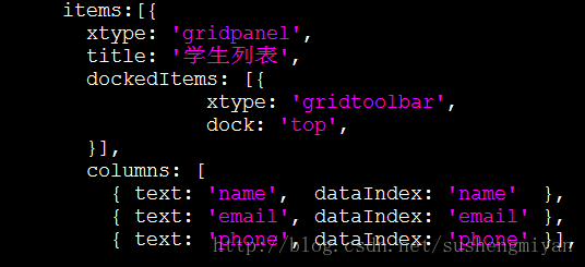 dockedItems: [ { xtype: "toolbar", items: [{ //xtype : "gridtoolbar", // 按钮toolbar text : "新增", glyph : 0xf016 },{ text : "修改", glyph : 0xf044 },{ text : "删除", glyph : 0xf014 },{ text : "查看", glyph : 0xf022 }], dock: "top", }],