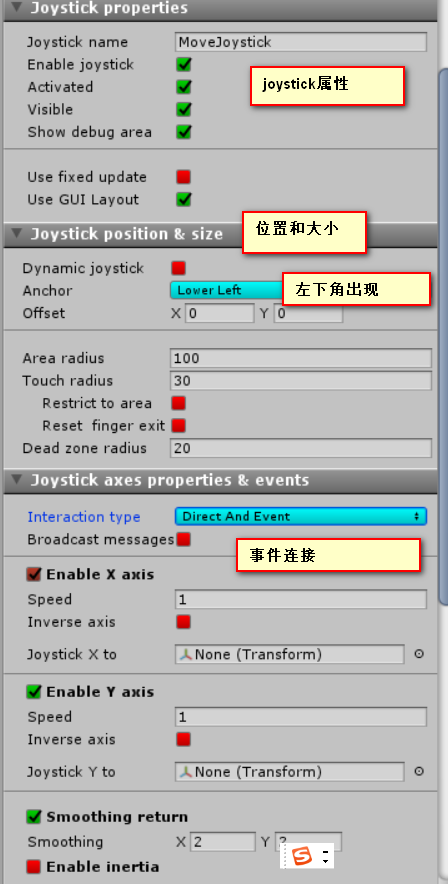 1.GUITexture制作,是unity自带的一个joystick组件,主要由GUITexture和一个JS脚本构成。优点:unity自带,使用简单方便。缺点是无法适应屏幕大小。