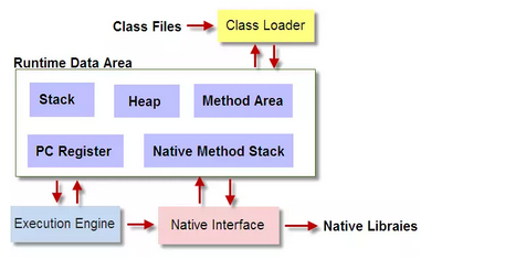 JVM由4大部分组成:ClassLoader,Runtime Data Area,Execution Engine,Native Interface。