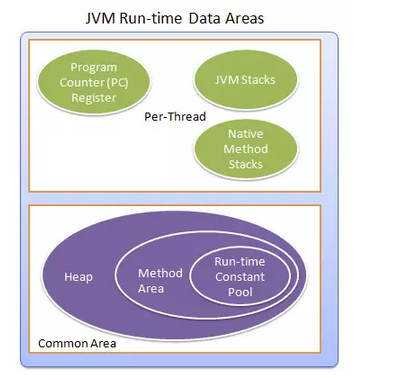 2.4.Runtime Data Area 则是存放数据的,分为五部分:Stack,Heap,Method Area,PC Register,Native Method Stack。几乎所有的关于java内存方面的问题,都是集中在这块。下图是javapapers.com上关于Run-time Data Areas的描述: