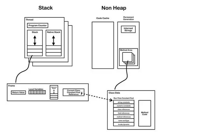 Area化为了Heap的一部分,javapapers.com中认为Method Area是Heap的逻辑区域,但这取决于JVM的实现者,而HotSpot JVM中把Method Area划分为非堆内存,显然是不包含在Heap中的。下图是javacodegeeks.com中,2014年9月刊出的一片博文中关于Runtime Data Area的划分,其中指出,NonHeap包含PermGen和Code