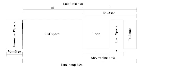 堆的大小通过-Xms和-Xmx来指定最小值和最大值,通过-Xmn来指定Young Generation的大小(一些老版本也用-XX:NewSize指定), 即上图中的Eden加FromSpace和ToSpace的总大小。然后通过-XX:NewRatio来指定Eden区的大小,在Xms和Xmx相等的情况下,该参数不需要设置。通过-XX:SurvivorRatio来设置Eden和一个Survivor区的比值。(参考自博文:)