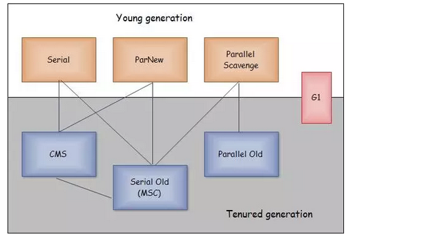 JVM中,不同的 内存区域作用和性质不一样,使用的垃圾回收算法也不一样,所以JVM中又定义了几种不同的垃圾回收器(图中连线代表两个回收器可以同时使用):