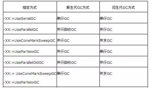 对于垃圾收集器的组合使用可以通过下表中的参数指定: