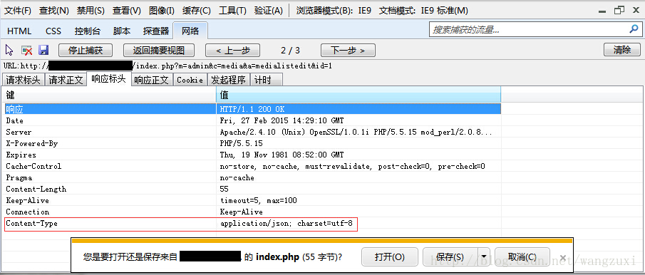 可以看出响应头中Content-Type是application/json,而IE以为这不是一个可以显示的格式就提示保存了,从而就没有把响应内容交给jQuery来处理。chrome浏览器只是提示一个告警(Resource interpreted as Document but transferred with MIME type application/json)后依然把响应交给jQuery来处理,所以就感觉像是正常的。因为Controller.class.php的两个函数success和error最终调用的是ajaxReturn,所以直接修改ajaxReturn,把header("Content-Type:application/json;