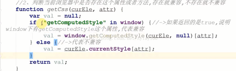 还是使用in的方法好一点点,因为判断getComputedStyle的方法是否存在与window中,直接返回true或者是false,而第二种方法还要根据返回的值转化为true或者false,这比较耗费浏览器的性能。