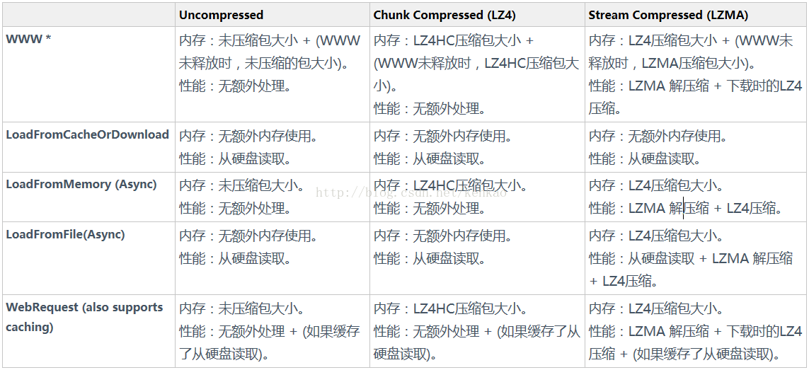 以上便是在运行时动态加载AssetBundle对象的方法。下面,我们再从加载过程中内存消耗的角度来对比一下这几种加载AssetBundle对象的方法,下表是Unity3D官方的一个中文版总结。