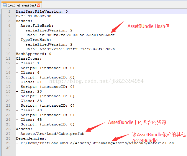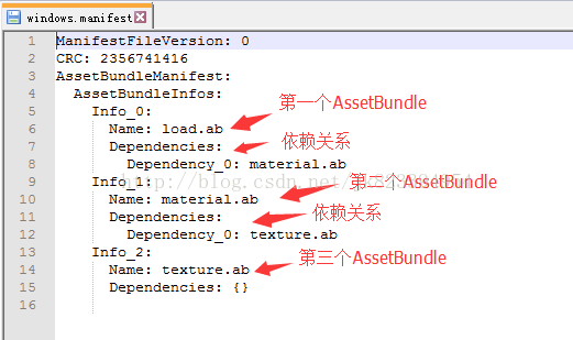 其中windows.manifest文件中记录了我们所有的AssetBundle信息和依赖关系