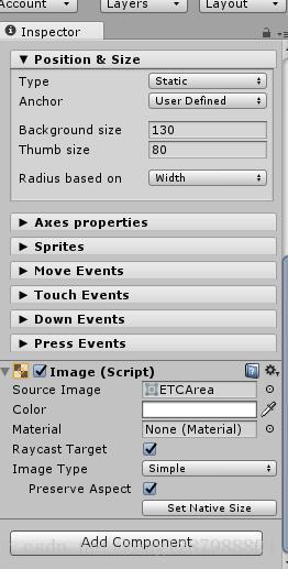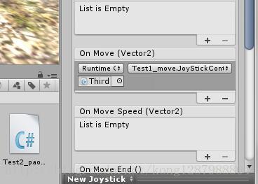 - Move Events、Touch Events、Down Events、Press Events:在这四个事件面板中,你可以设置任何系统中已定义的时间,使用方式和UGUI/NGUI的事件调用方式类似,将项目中已经存在的调用方法直接拖到控件上即可。joystick,DPad,TouchPad这几种控件的事件响应机制类似,可以很容易的实现重用和替换。