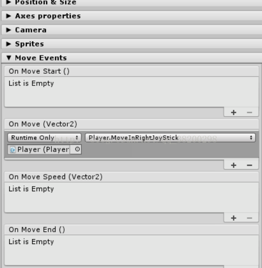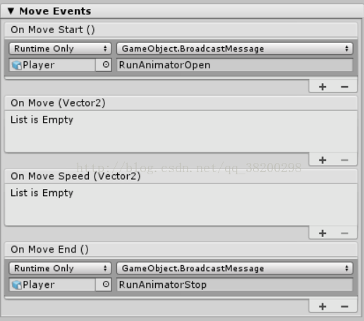 public void RunAnimatorOpen() { m_Animator.SetBool("move", true); } public void RunAnimatorStop() { m_Animator.SetBool("move", false); }然后在leftjoystick的etc的MoveEvents框中的OnMoveStart()和OnMoveEnd()