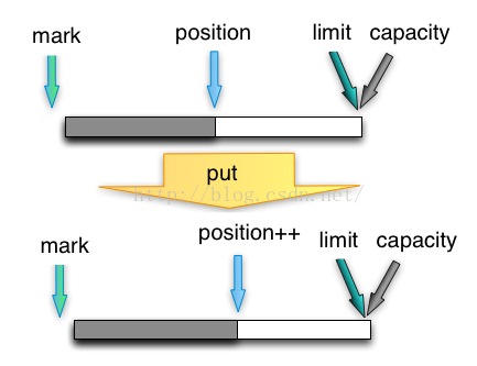 写模式下,往buffer里写一个字节,并把postion移动一位。写模式下,一般limit与capacity相等。