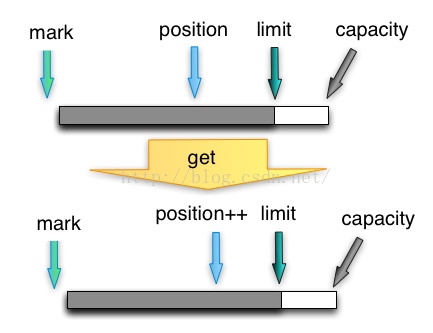 从buffer里读一个字节,并把postion移动一位。上限是limit,即写入数据的最后位置。