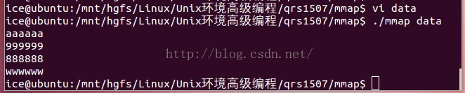 #include <sys/mman.h> #include <sys/stat.h> #include <fcntl.h> #include <stdio.h> #include <stdlib.h> #include <unistd.h> #include <error.h> #define BUF_SIZE 100 int main(int argc, char **argv) { int fd, nread, i; struct stat sb; char *mapped, buf[BUF_SIZE]; for (i = 0; i < BUF_SIZE; i++) { buf[i] = "#"; } /* 打开文件 */ if ((fd = open(argv[1], O_RDWR)) < 0) { perror("open"); } /* 获取文件的属性 */ if ((fstat(fd, &sb)) == -1) { perror("fstat"); } /* 将文件映射至进程的地址空间 */ if ((mapped = (char *)mmap(NULL, sb.st_size, PROT_READ | PROT_WRITE, MAP_SHARED, fd, 0)) == (void *)-1) { perror("mmap"); } /* 映射完后, 关闭文件也可以操纵内存 */ close(fd); printf("%s", mapped); /* 修改一个字符,同步到磁盘文件 */ mapped[20] = "9"; if ((msync((void *)mapped, sb.st_size, MS_SYNC)) == -1) { perror("msync"); } /* 释放存储映射区 */ if ((munmap((void *)mapped, sb.st_size)) == -1) { perror("munmap"); } return 0; }测试结果