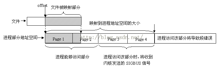 #include <sys/mman.h> #include <stdio.h> #include <stdlib.h> #include <unistd.h> #define BUF_SIZE 100 int main(int argc, char** argv) { char *p_map; /* 匿名映射,创建一块内存供父子进程通信 */ p_map = (char *)mmap(NULL, BUF_SIZE, PROT_READ | PROT_WRITE, MAP_SHARED | MAP_ANONYMOUS, -1, 0); if(fork() == 0) { sleep(1); printf("child got a message: %s ", p_map); sprintf(p_map, "%s", "hi, dad, this is son"); munmap(p_map, BUF_SIZE); //实际上,进程终止时,会自动解除映射。 exit(0); } sprintf(p_map, "%s", "hi, this is father"); sleep(2); printf("parent got a message: %s ", p_map); return 0; } #include <sys/mman.h> #include <stdio.h> #include <stdlib.h> #include <unistd.h> #define BUF_SIZE 100 int main(int argc, char** argv) { char *p_map; /* 匿名映射,创建一块内存供父子进程通信 */ p_map = (char *)mmap(NULL, BUF_SIZE, PROT_READ | PROT_WRITE, MAP_SHARED | MAP_ANONYMOUS, -1, 0); if(fork() == 0) { sleep(1); printf("child got a message: %s ", p_map); sprintf(p_map, "%s", "hi, dad, this is son"); munmap(p_map, BUF_SIZE); //实际上,进程终止时,会自动解除映射。 exit(0); } sprintf(p_map, "%s", "hi, this is father"); sleep(2); printf("parent got a message: %s ", p_map); return 0; }4.对mmap()返回地址的访问 linux采用的是页式管理机制。对于用mmap()映射普通文件来说,进程会在自己的地址空间新增一块空间,空间大小由mmap()的len参数指定,注意,进程并不一定能够对全部新增空间都能进行有效访问。进程能够访问的有效地址大小取决于文件被映射部分的大小。简单的说,能够容纳文件被映射部分大小的最少页面个数决定了进程从mmap()返回的地址开始,能够有效访问的地址空间大小。超过这个空间大小,内核会根据超过的严重程度返回发送不同的信号给进程。可用如下图示说明: