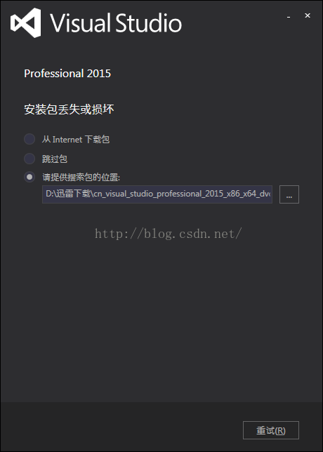 ...cn_visual_studio_professional_2015_x86_x64_dvd_6846645packagesvcRedistD14debugx86vc_runtimeDebug_x86.msi,点击重试,如下图: